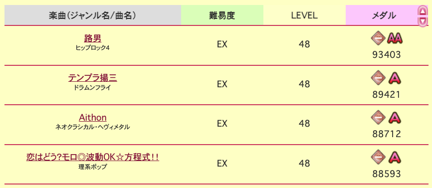 우선 공식 홈페이지는 그리 좋은 선택지가 아니다. 10년 가까이 된 UI를 그대로 사용하고 있으며 히라가나 순(알파벳 순) 또는 레벨 순서대로 모든 곡을 보여주기 때문이다. 정렬 기능이 있다지만 메달(게임 중 잘못된 입력의 개수에 따라 부여된다) 순서로만 정렬할 수 있어 크게 도움이 되지 않는다.